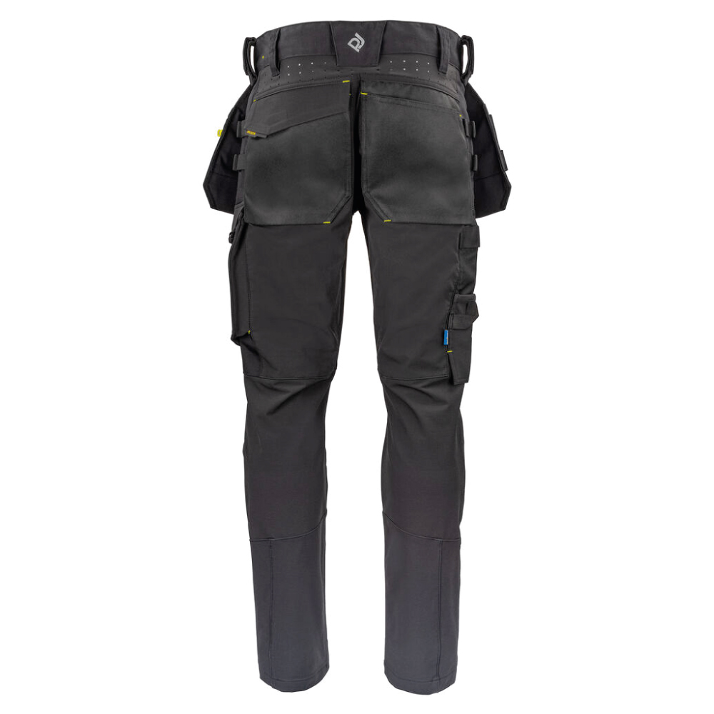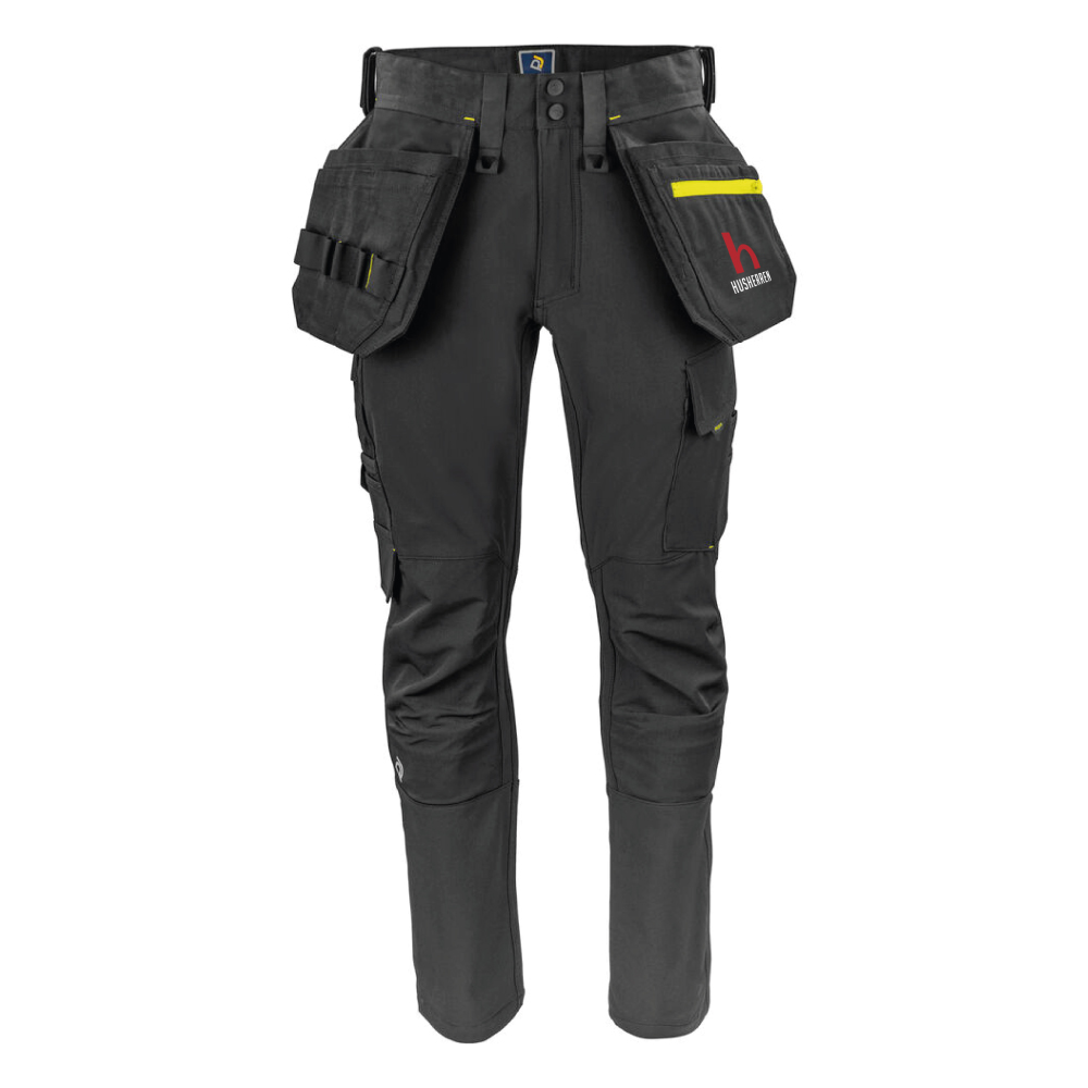 Hantverksbyxa i fullstretch för maximal rörelsefrihet. Modern passform. Sidorna upptill är inte i stretch för att ge stadga åt byxan. Hängfickor med Cordura®förstärkt insida, varav den ena med dragkedja. Hängfickorna går att ta av genom att sprätta en kontrastfärgad, dold tråd. Ventilation bak i midjan. Benfickor, på vänster sida med plats för verktyg och penna, även en mobilficka med magnetlås samt fäste för ID-kortshållare. På höger sida tumstocks- och verktygsficka med knivknapp. Fästen för verktygshållare. Bakfickor i Cordura®, den ena med lock med magnetlås. Förböjda knän med knäskyddsfickor som går att reglera i två höjder, öppning inifrån. Knäna är förstärkta med Cordura®stretch för maximal hållbarhet och rörelsefrihet. Möjlighet att fästa MOLLE- system på båda sidor.