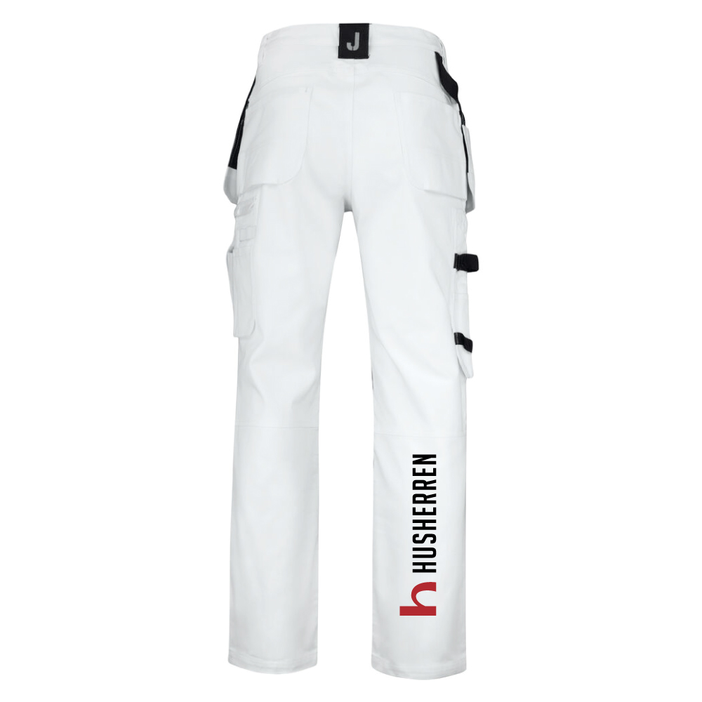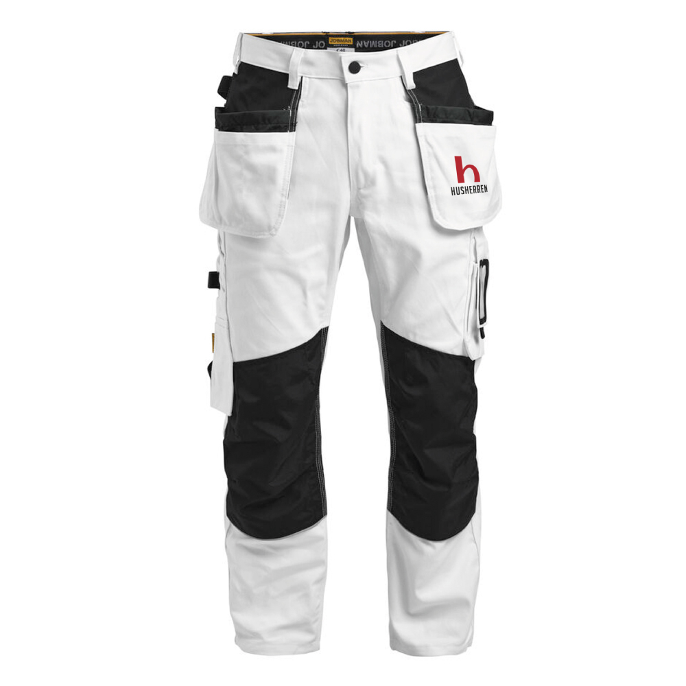 Målarbyxa med utmärkt passform och design utvecklad för yrkesverksamma målare. Jobmans bomullstwill har goda egenskaper, den är slitstark, absorberar färg och minimerar genomblödning. Målarbyxan är försedd med rymliga hölsterfickor, den inre fickans insida är fodrade med vattenavvisande FA™ polyamid. Rymliga fram och bakfickor, benficka med extra fack och blixtlås, mobilficka samt ID-kortsfack. Kniv och tumstocksficka med användbara fack för alla tänkbara måleriverktyg. Byxan har en ögla för trasa. Tål 85 grader tvätt. Knäfickor i slitstarka FA™ polyamid med två positioner för knäskydd.